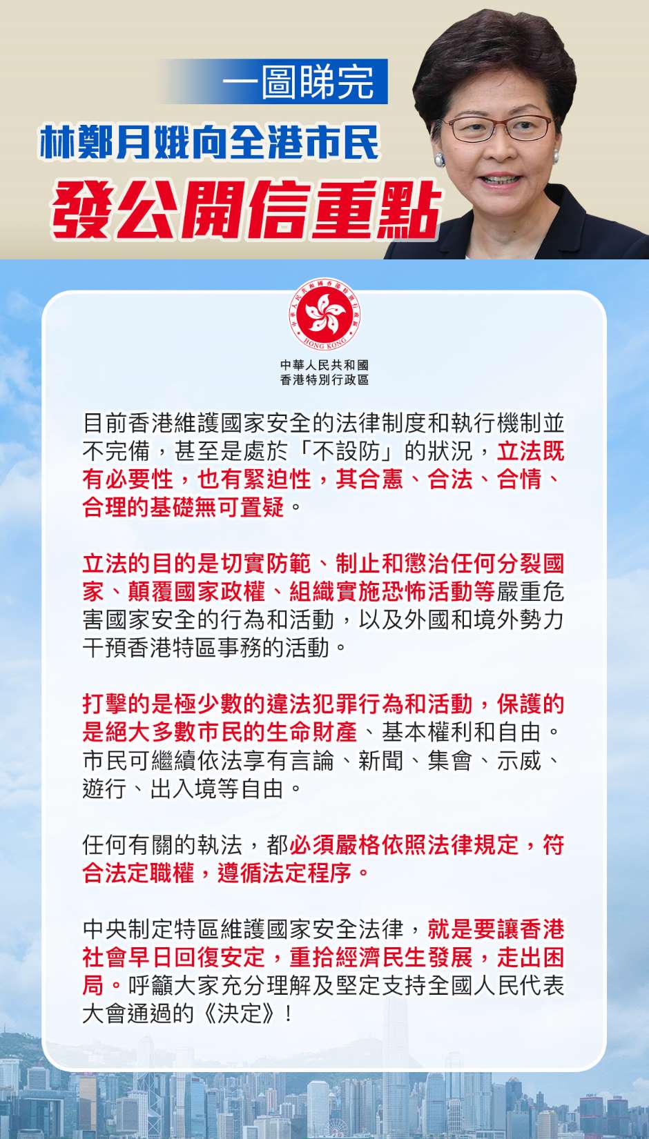 林鄭月娥指,過去一年社會飽受創傷,香港已成為國家安全缺口,建立港區國安法有必要性及緊迫性。