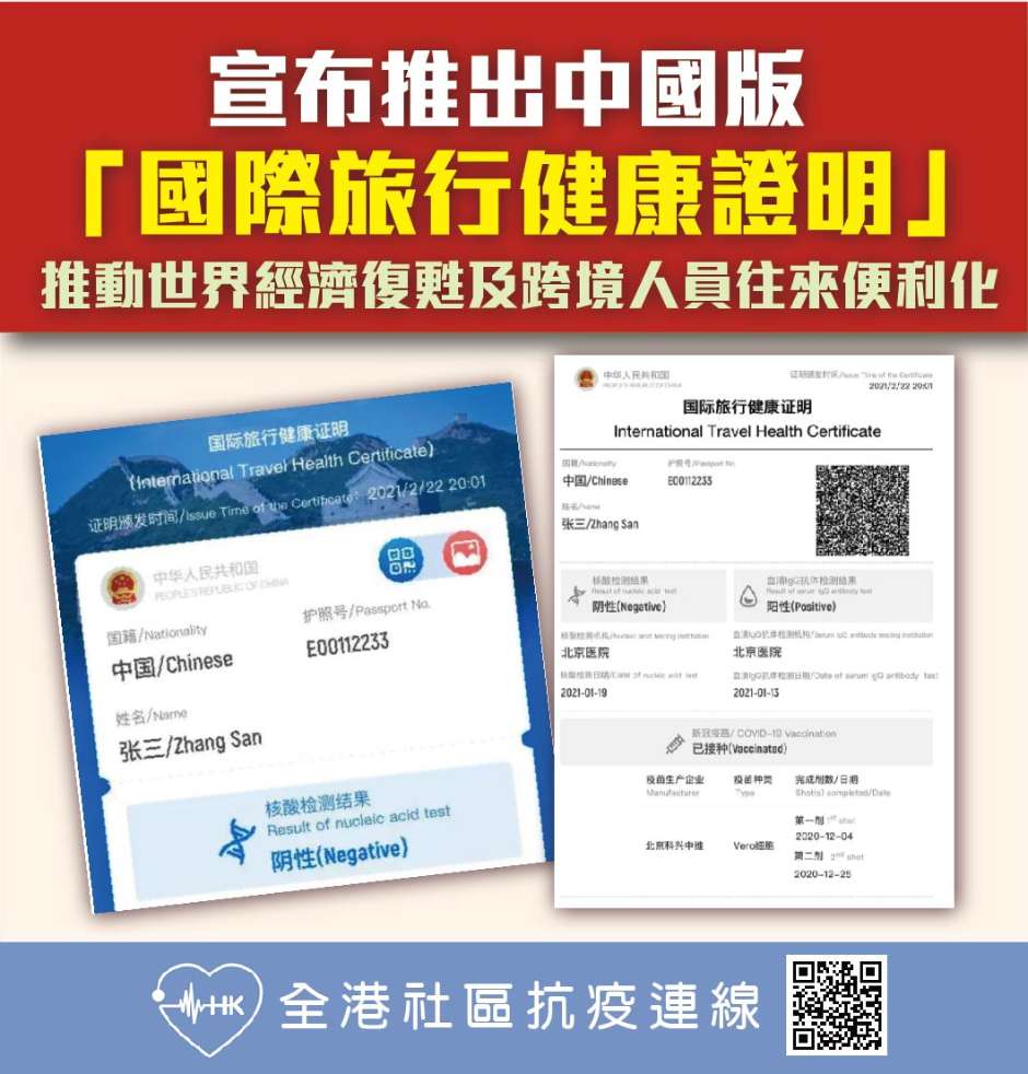 宣布推出中國版國際旅遊健康證明