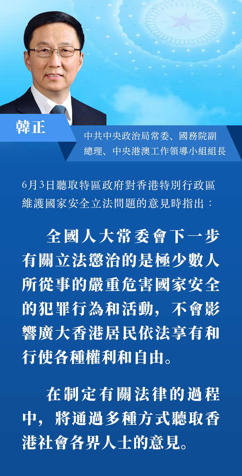 韓從國家層面進行香港國安立法,針對的是搞「港獨」、「黑暴」等極少數人,「歸根到底,懲治是極少數的」。