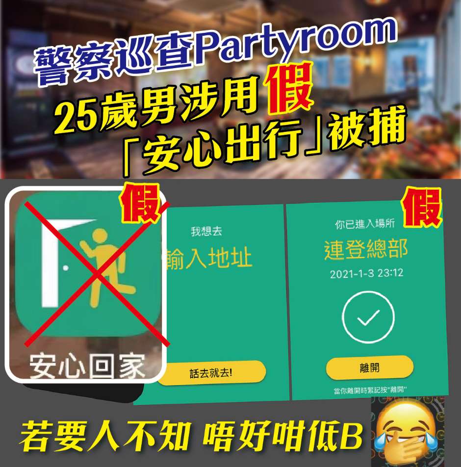警察巡查party room 25歲男用假安心出行被捕