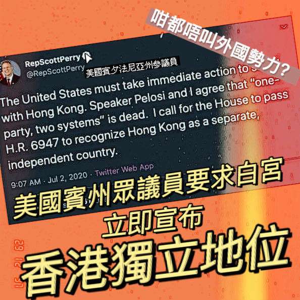 美國賓州眾議員要求白宮立刻宣佈香港獨立地位