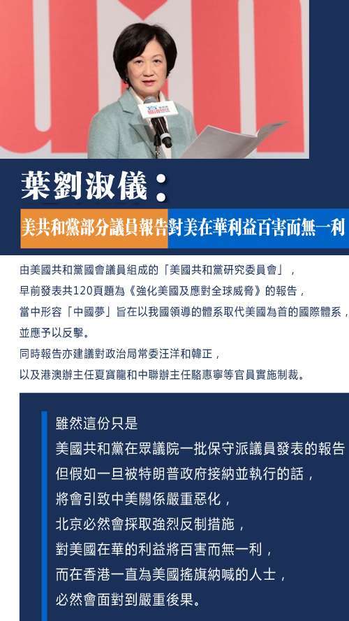 葉劉淑儀:美共和黨報告對美國在華利益百害無一利