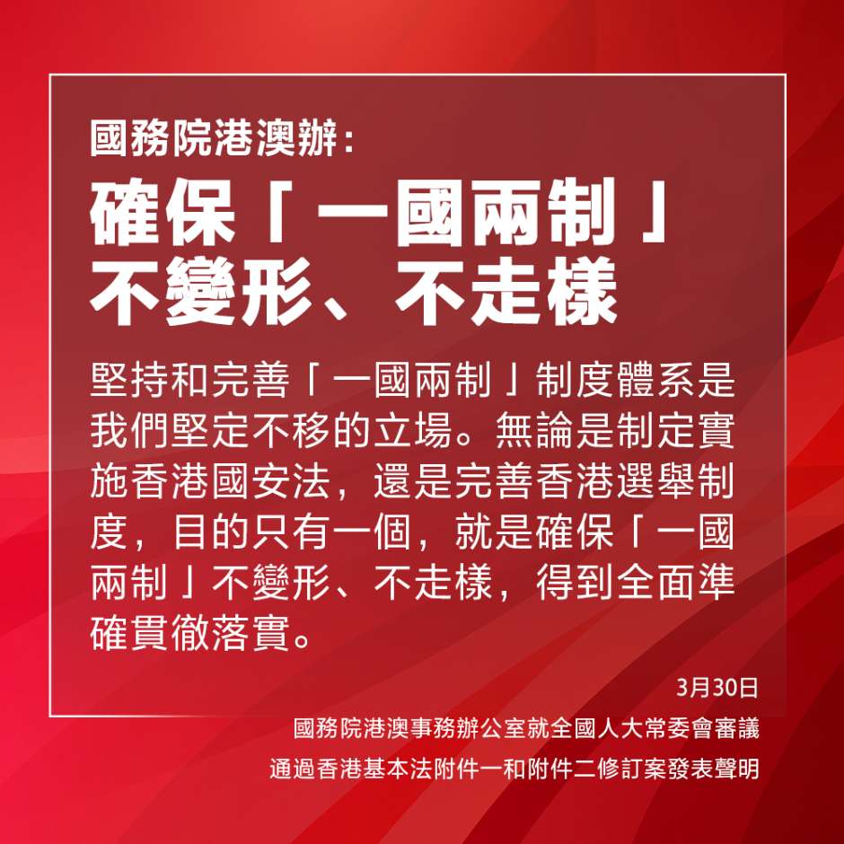 國務院港澳辦:確保一國兩制不變形 不走樣