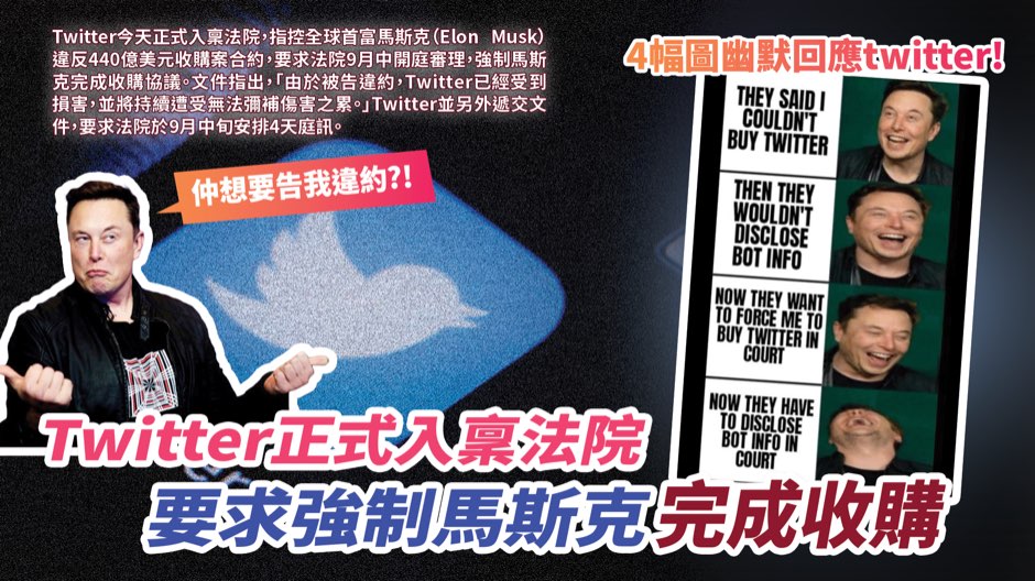 Twitter 正式入稟法院 要求強制馬斯克完成收購
